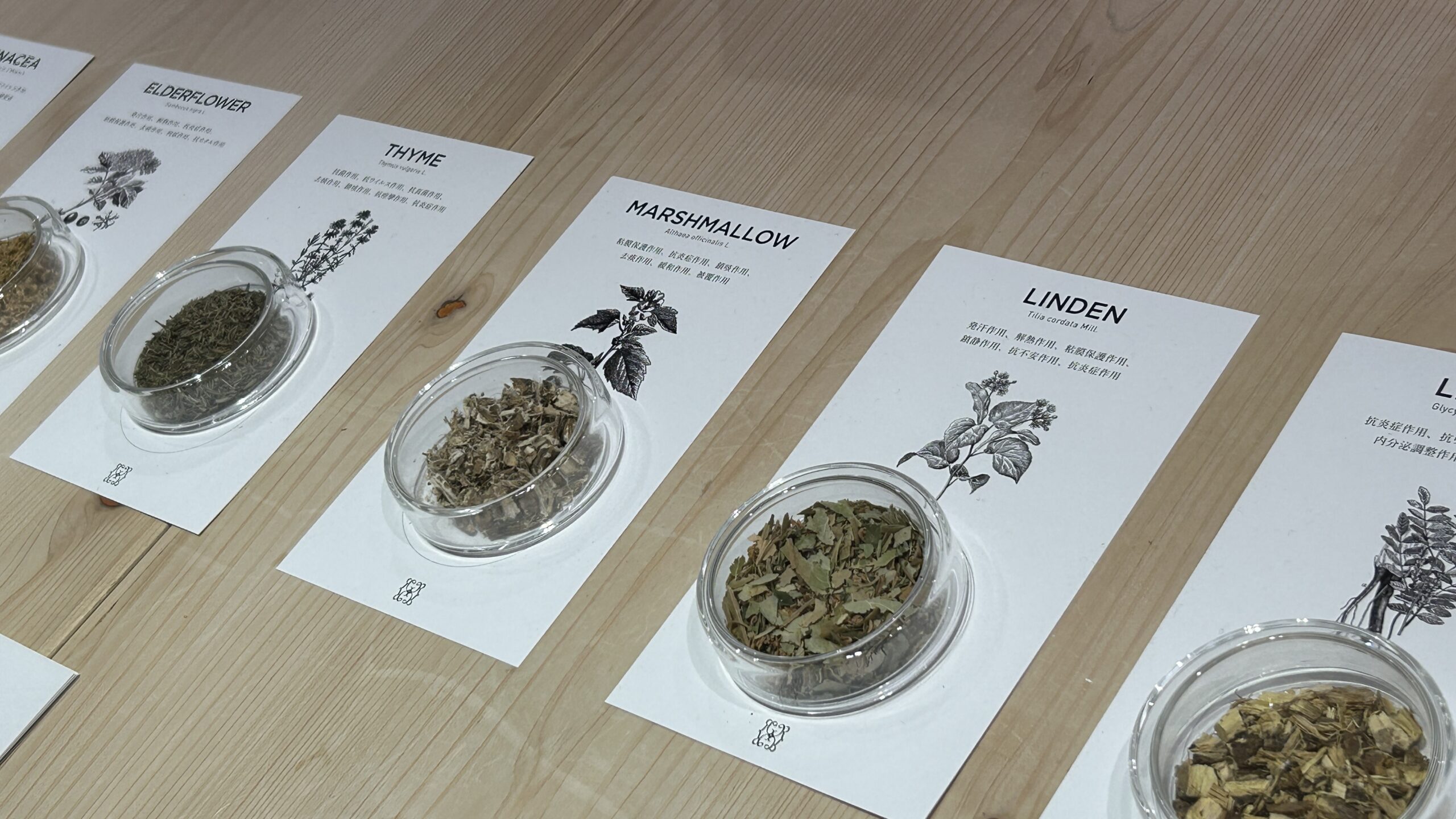 今回のワークショップでは、リラックスや睡眠をテーマに選んだ6種類のハーブをご用意しました。まずは、それぞれのシングルハーブを一つずつ丁寧にテイスティングし、香りや味わいはもちろん、五感を使って感じ取る官能評価を体験していただきます。